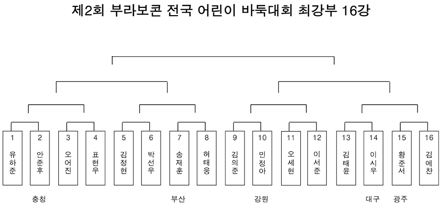 - 11/1(토) 최강부 예선에서 선발된 11명은 각 지역대회 우승자 5명과 함께 추후 바둑TV 스튜디 오에서 개최될 16강 본선 토너먼트에 참가하게 됩니다.